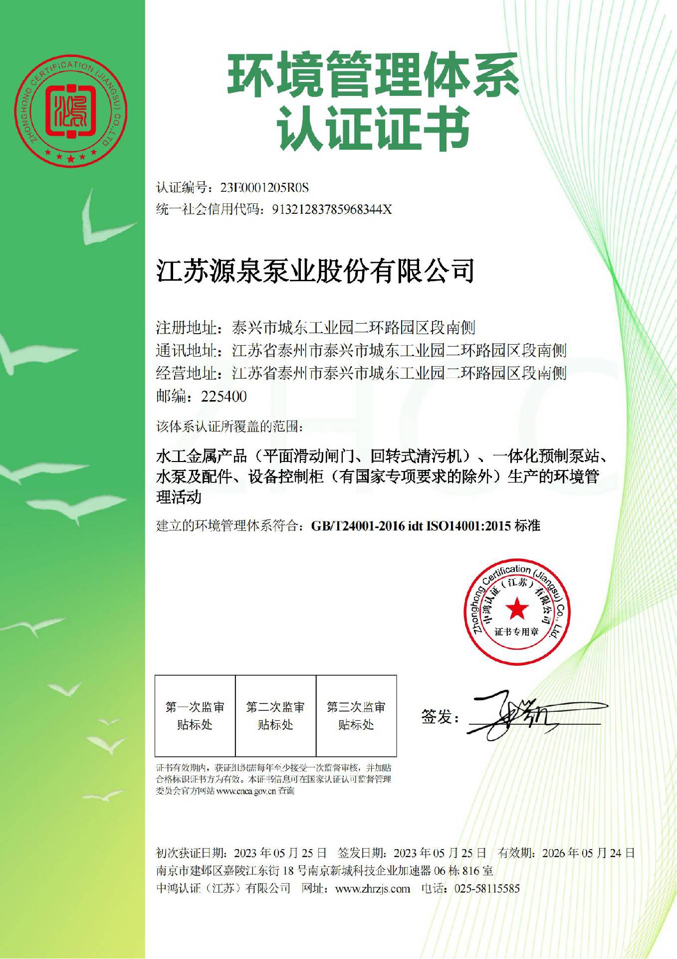 环境管理体系认证证书